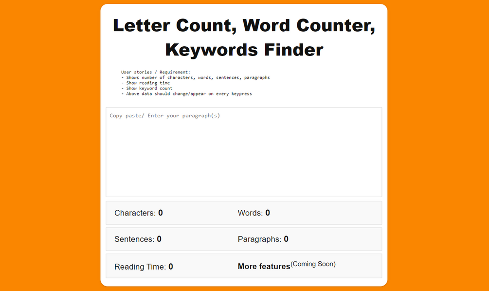 Letter Count, Word Counter, Keywords Finder Tool (Using HTML, CSS, Javascript)